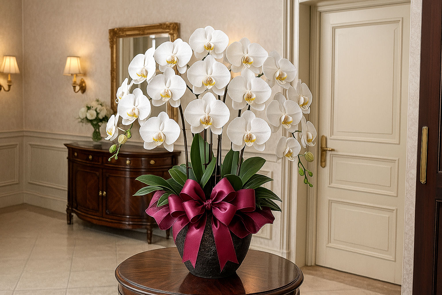 胡蝶蘭の造花は、玄関やリビングなど、来客が目につきやすい場所に飾ると、空間全体を華やかに彩ります。 特に、玄関に飾る場合は、来客を迎える第一印象を良くするためにも、清潔感があり、明るい場所に飾りましょう。 会社の受付やオフィスに飾る場合は、周囲のインテリアとの調和を考慮し、落ち着いた雰囲気になるよう配置することが大切です。 また、スペースに合わせて最適なサイズと配置を選ぶことも重要です。 広々とした空間であれば、大輪の胡蝶蘭を複数配置しても良いですが、狭い空間では、コンパクトなサイズを選ぶ方がバランスが良いでしょう。 場所の広さや雰囲気を考慮して、最適な飾り方を選びましょう。