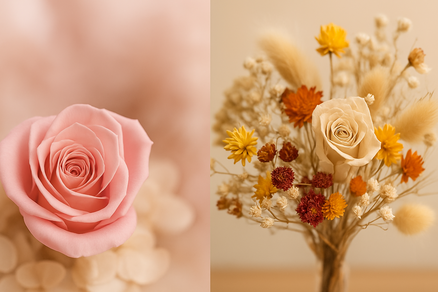 プリザーブドフラワーとドライフラワー、それぞれの特徴を理解した上で、両者を比較することで、より明確な違いが見えてきます。この比較表では、価格、耐久性、見た目、お手入れ方法などを分かりやすく一覧化しました。それぞれのメリット・デメリットを改めて確認し、あなたに最適なフラワーアレンジメント選びにお役立てください。